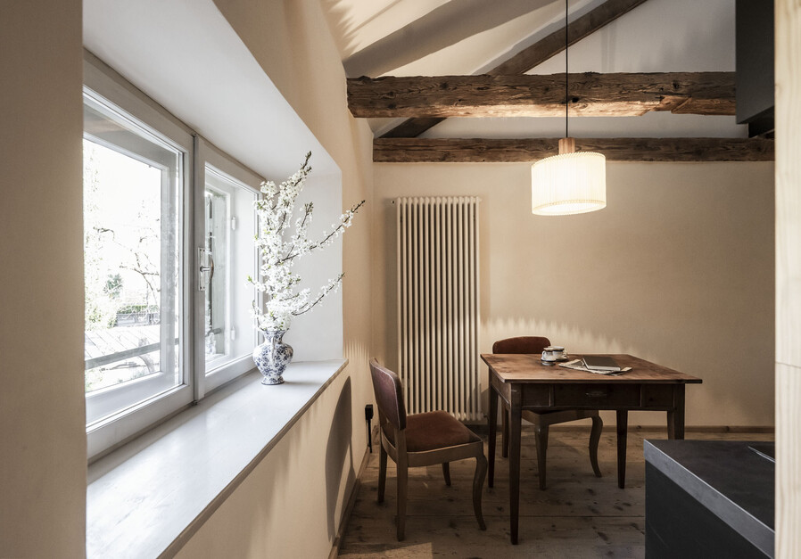 Die Rosl Loft erstreckt sich über zwei Stockwerke. Unten befindet sich die Küche samt Wohnbereich, Doppelbett und Schlafsessel, oben das Doppelbett. Durch das hübsche Gaubenfenster unten ist das ROSL Loft stets lichtdurchflutet.